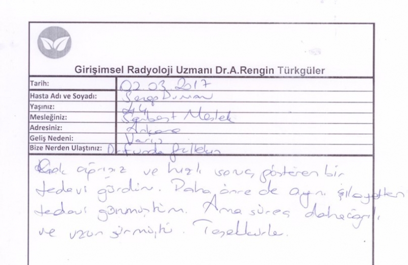 Çok ağrısız ve hızlı sonuç gösteren bir tedavi gördüm. Daha öncede aynı şikayetten tedavi görmüştüm. Ama süreç daha ağrılı ve uzun sürmüştü. Teşekkürler.