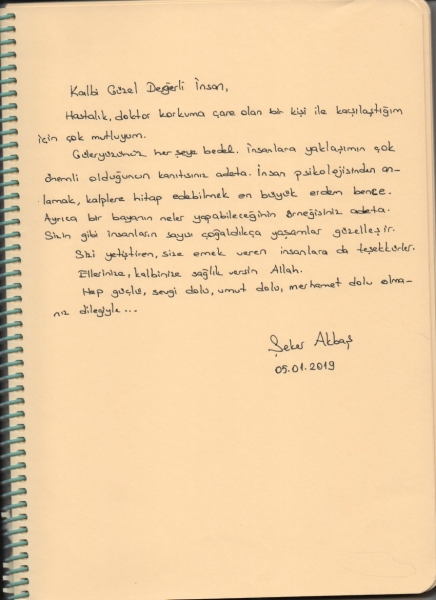 Kalbi Güzel Değerli İnsan, Hastalık,doktor korkuma çare olan bir kişi ile karşılaştığım için çok mutluyum. Güler yüzünüz herşeye bedel.İnsanlara yaklaşımın çok önemli olduğunun kanıtısınız adeta. İnsan psikolojisinden anlamak, kalplere hitap edebilmek en büyük erdem bence.Ayrıca bir bayanın neler yapabileceğinin örneğisiniz adeta. Sizin gibi insanların sayısı çoğladıkça yaşamlar güzelleşir. Sizi yetiştiren,size emek veren insanalara da teşekkürler. Ellerinize,kalbinize sağlık versin Allah. Hep güçlü,sevgi dolu,umut dolu,merhamet dolu olmanız dileğiyle... Şeker Akbaş 05.01.2019